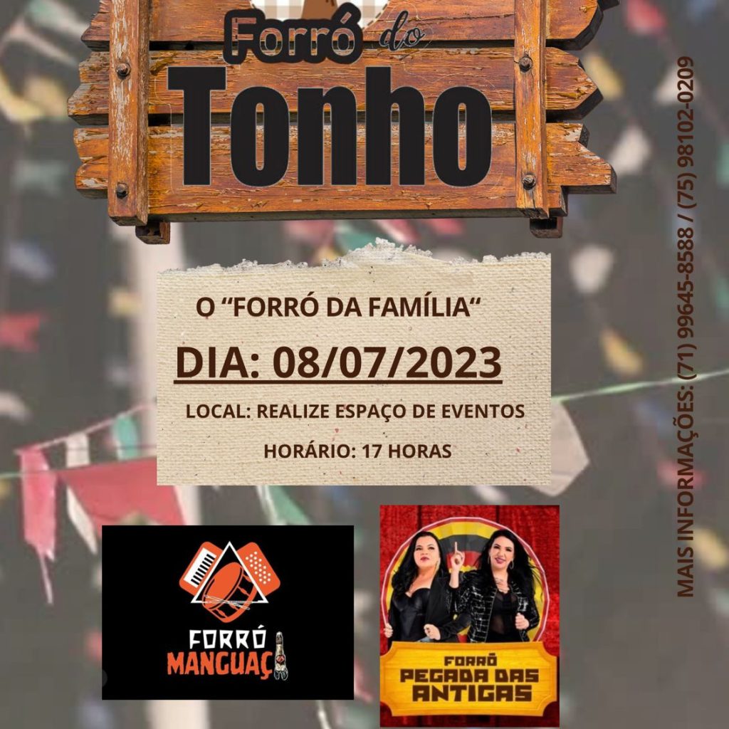 Considerado como “o forró da família”, o Forró do Tonho terá como atrações, neste ano, as bandas Forró Manguaça e Forró Pegada das Antigas. Mais informações podem ser obtidas através dos números (71) 99645-8588 e/ou (75) 98102-0209.