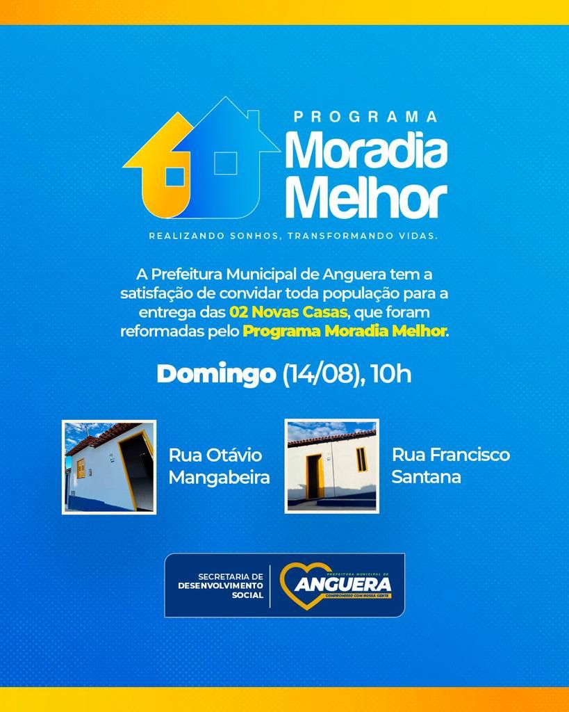 Mais duas casas reformadas pelo programa Moradia Melhor serão entregues pela prefeitura de Anguera. A entrega será feita neste domingo (14) às 10h. Uma casa fica na rua Otávio Mangabeira outra na rua Francisco Santana.