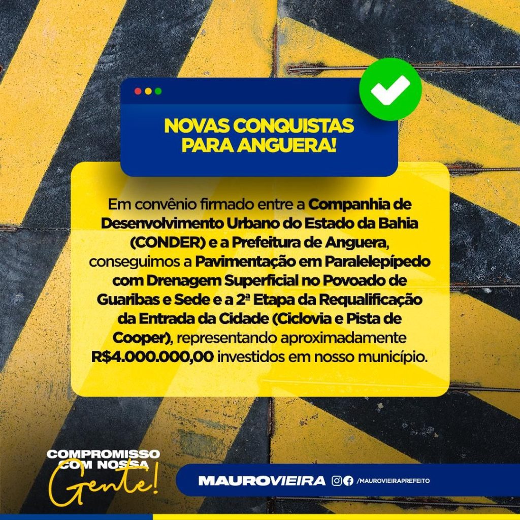 Em convênio firmado entre a Companhia de Desenvolvimento Urbano do Estado da Bahia (CONDER), a Prefeitura de Anguera, realizará a Pavimentação em Paralelepípedo com Drenagem Superficial no Povoado de Guaribas e Sede, além da segunda etapa da Requalificação da Entrada da Cidade (Ciclovia e Pista de Cooper), representando aproximadamente R$4.000.000,00 investidos no município.