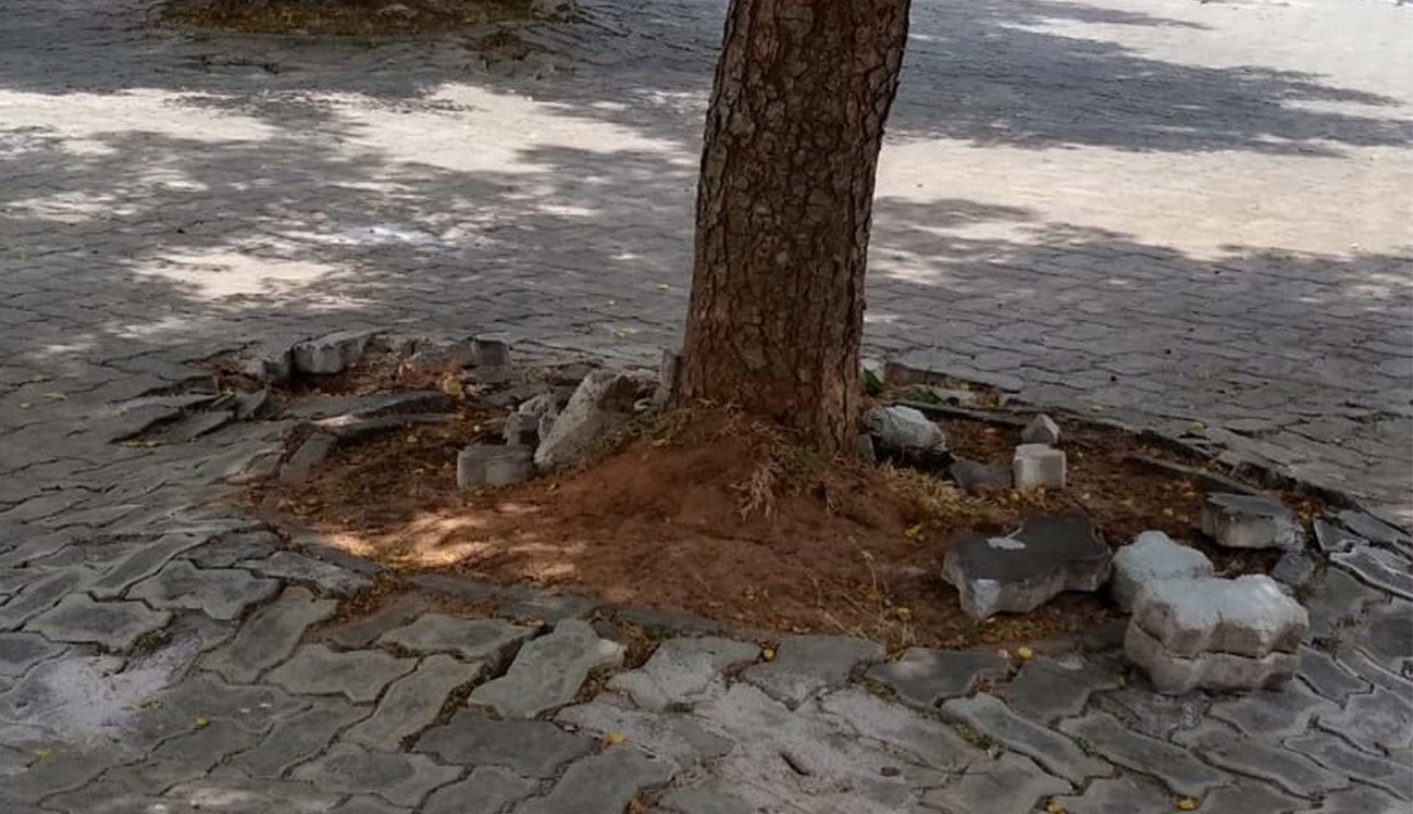 O diretor de Áreas Verdes aponta que o piso do canteiro central, no trecho em frente ao Colégio Asas, foi danificado pelas volumosas raízes dessas árvores, inclusive afetando o mobiliário.