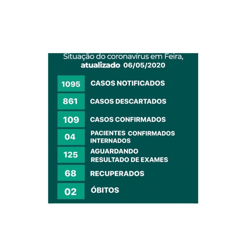 “Até o dia 06 de maio as 18:00h em Feira de Santana foram notificados 1.094 casos suspeitos da COVID-19, sendo 861 casos descartados, 125 casos aguar- dando resultado de exames laboratoriais, e 109 casos confirmados pelo LACEN (Laboratório Central da Bahia).