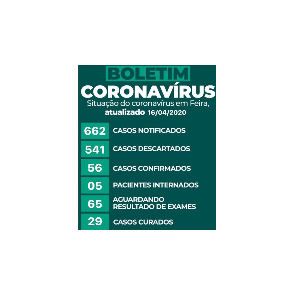BOLETIM CORONAVÍRUS: Em Feira são 56 casos confirmados e 29 curados