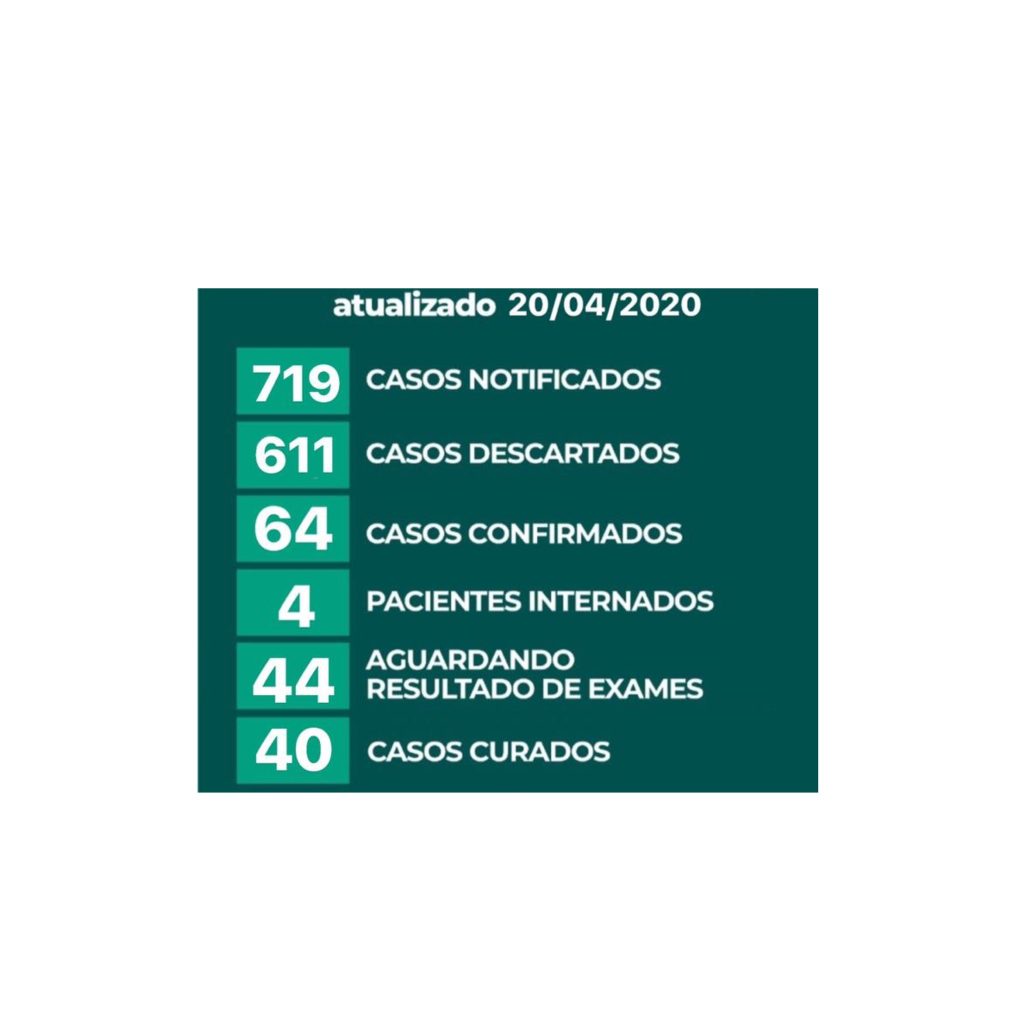 Segundo a Secretaria Municipal de Saúde, em Feira de Santana foram notificamos 719 casos do novo coronavírus, 611 descartados, 64 confirmados, 4 pacientes internados, 44 aguardando exames e 40 curados da COVID-19. Os dados foram divulgados na última segunda-feira (20), pela Vigilância Epidemiológica.