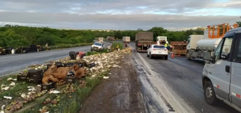 Segundo a PRF, as frutas foram espalhadas por parte da estrada e também pelo acostamento central. Equipes da corporação estão no local realizando os trabalhos de remoção da carga e liberação da via.