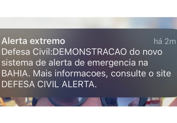 “Defesa Civil: DEMOSTRAÇÃO do novo sistema de alerta de emergência na BAHIA. Mais informações, consulte o site Defesa Civil Alerta”, diz o comunicado.