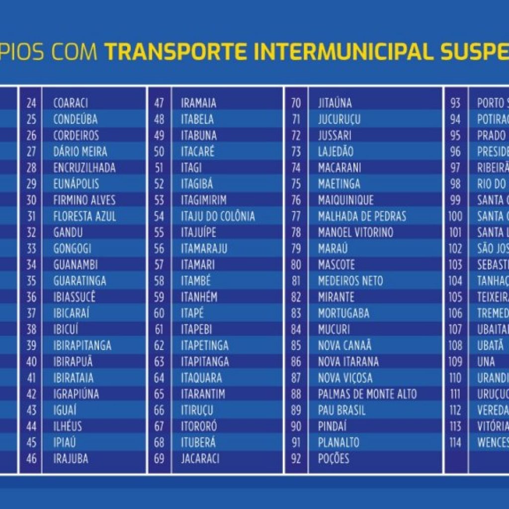 Segundo Rui, nessas cidades as taxas de contaminação e internamento em decorrência da Covid-19 ainda estão em nível alto. Ao todo, 115 cidades continuam com restrição de transporte intermunicipal. Além das citadas, a lista tem Vitória da Conquista, Brumado, Ibicuí, Guanambi, Ipiaú, Maraú, Poções, Prado, Ubatã, Uruçuca, entre outras. Veja abaixo a lista com os 115 municípios ainda com veto de transporte intermunicipal.