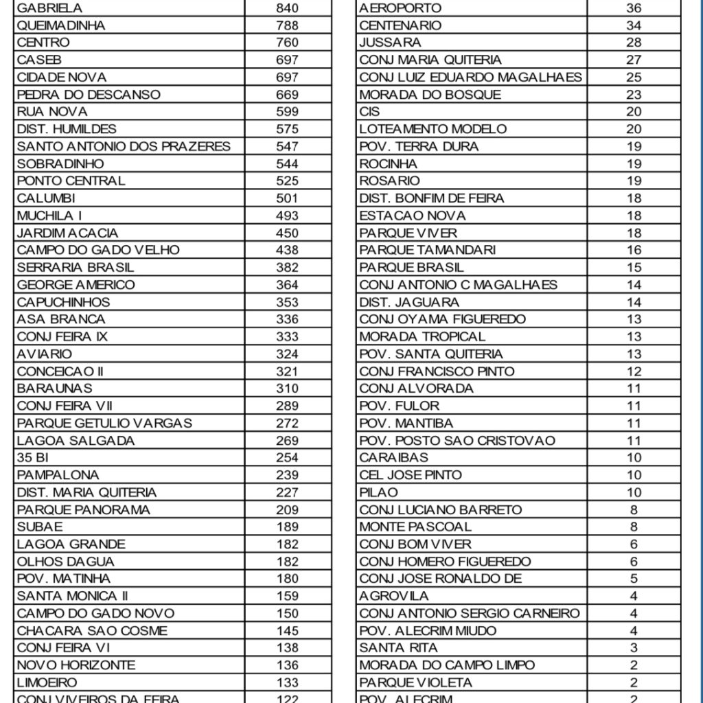 A Prefeitura de Feira de Santana, através da Divisão de Vigilância Epidemiológica da Secretaria Municipal de Saúde, divulgou nesta sexta-feira (09) a relação atualizada do número de casos de Covid-19 por bairros e localidades. O SIM é o bairro com o maior número, com 1.776 casos confirmados.