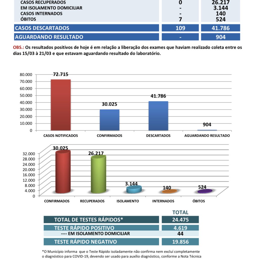 Casos confirmados no dia: 258 Pacientes recuperados no dia: 0 Resultados negativos no dia: 109 Total de pacientes hospitalizados no município: 140 Óbitos comunicados no dia: 7 Datas dos óbitos: 14/03, 17/03, 21/03, 21/03, 23/03, 24/03 e 24/03