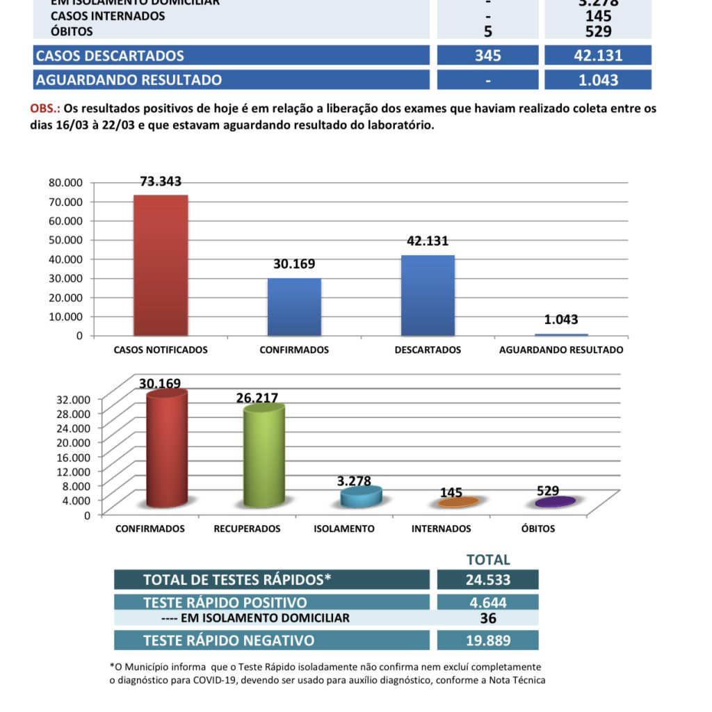 Total de pacientes ativos: 3.423 Total de casos confirmados no município: 30.169 (Período de 06 de março de 2020 a 26 de março de 2021) Total de pacientes em isolamento domiciliar: 3.278 Total de recuperados no município: 26.217 Total de exames negativos: 42.131 (Período de 06 de março de 2020 a 26 de março de 2021) Aguardando resultado do exame: 1.043 Total de óbitos: 529
