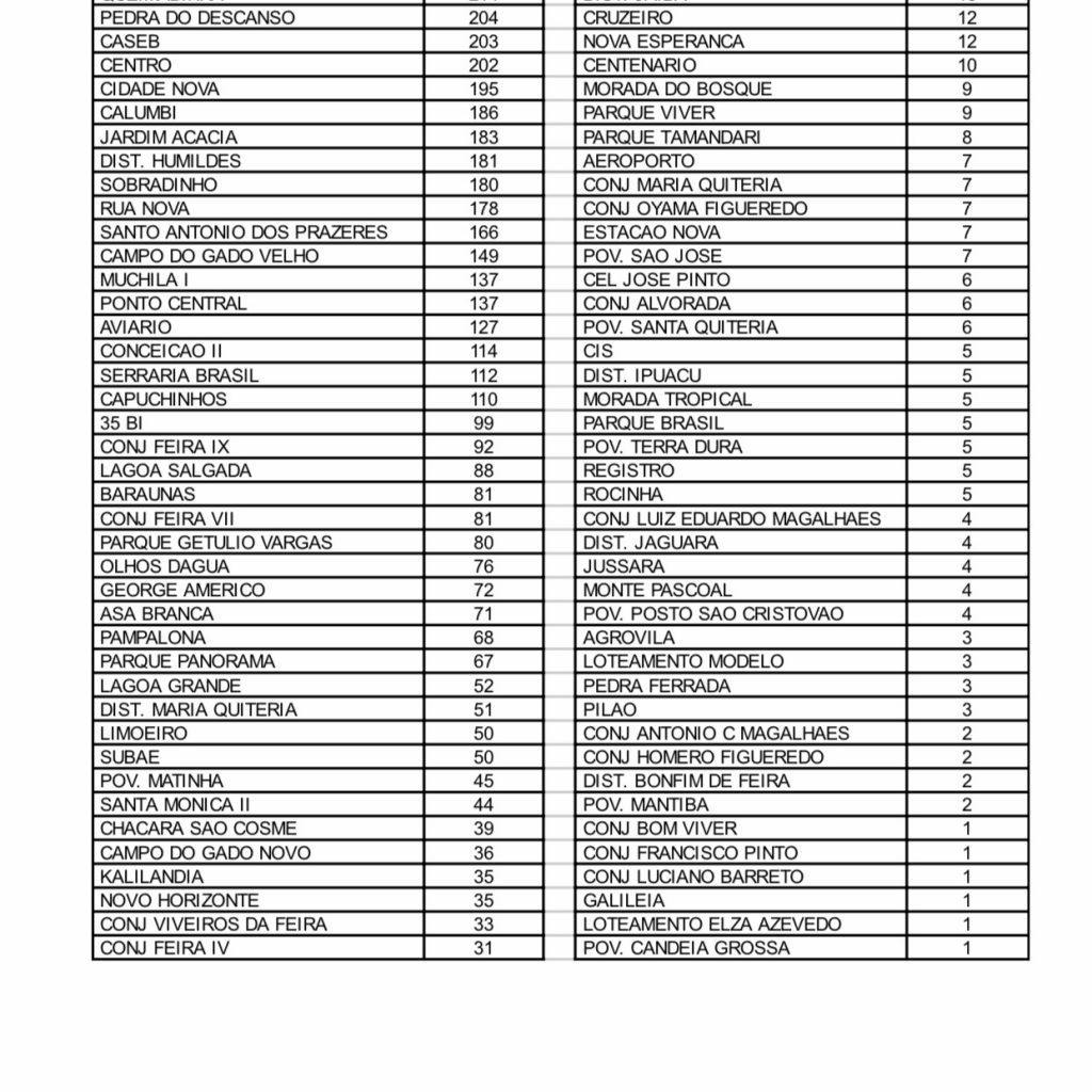 A Prefeitura de Feira de Santana, através da Divisão de Vigilância Epidemiológica da Secretaria Muncipal de Saúde, divulgou nesta sexta-feira (11) a relação atualizada do número de casos de Covid-19 por bairros e localidades. O bairro Tomba continua registrando o maior número, com 585 casos confirmados.