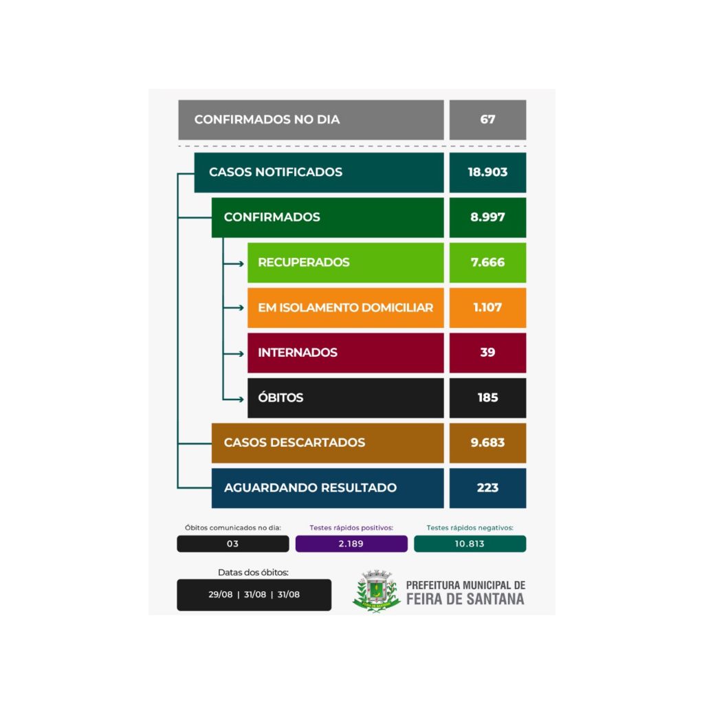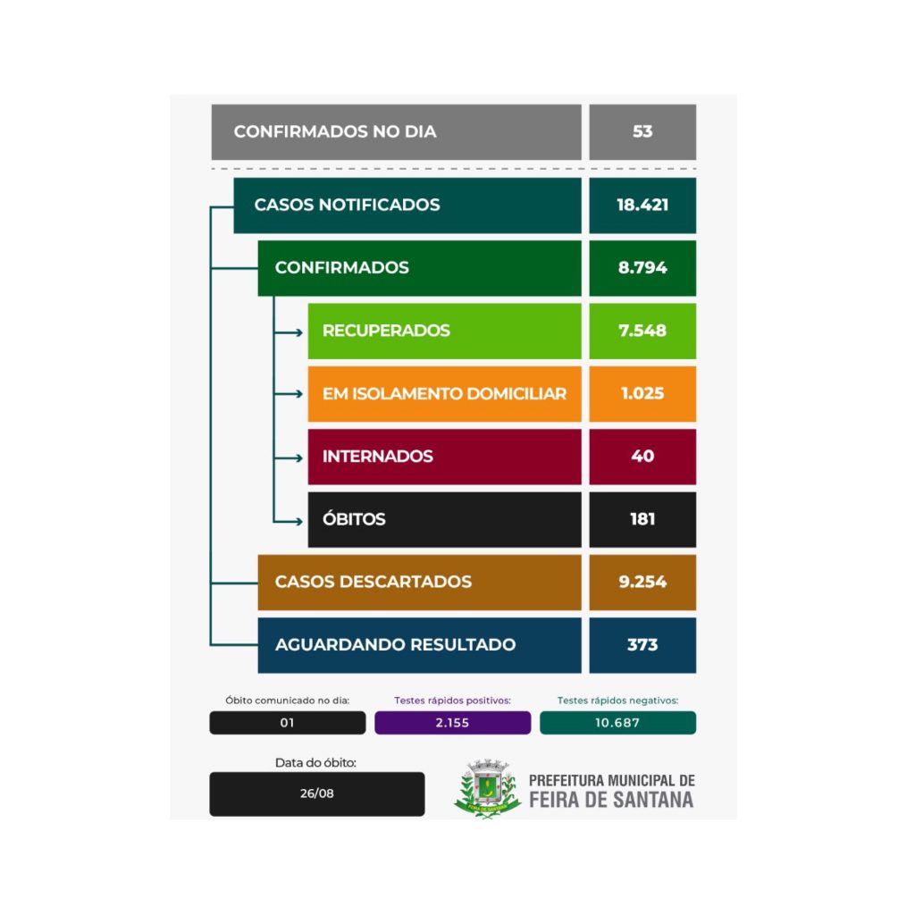 Nas últimas 24h, Feira de Santana não registrou nenhum óbito por Covid-19 e atingiu a marca de 7.591 curados, o índice representa 85% dos casos confirmados. 63 pessoas testaram negativo para o vírus, enquanto 14 casos foram positivos.