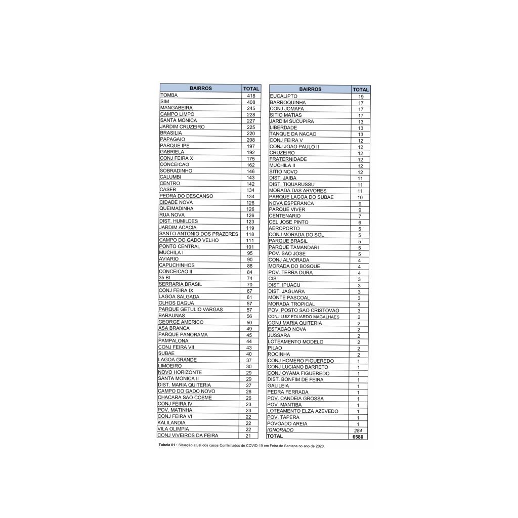 A Prefeitura de Feira de Santana, através da Divisão de Vigilância Epidemiológica da Secretaria Municipal de Saúde, divulgou através do boletim epidemiológico desta sexta-feira, 24, a relação de casos de Covid-19 por bairros e localidades. O Tomba segue liderando a lista pela segunda semana consecutiva, com 418 casos confirmados.