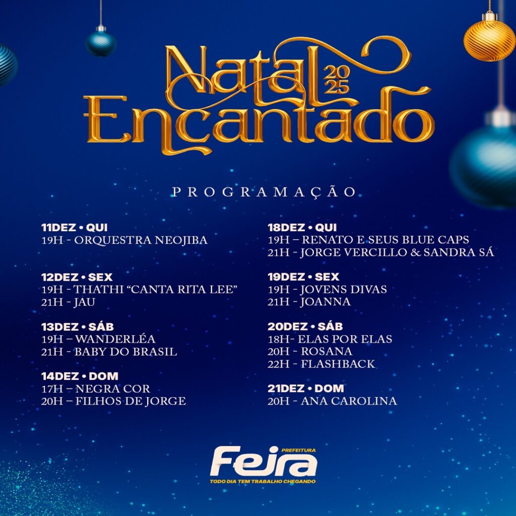 A abertura do Natal Encantado será no dia 11 de dezembro, com apresentação da Orquestra Neojiba. Ao longo dos dias, nomes consagrados da música brasileira e artistas locais se revezarão no palco, incluindo Thathi canta Rita Lee, Baby do Brasil, Filhos de Jorge, Jorge Vercillo & Sandra Sá, Rosana, Ana Carolina, entre outros.