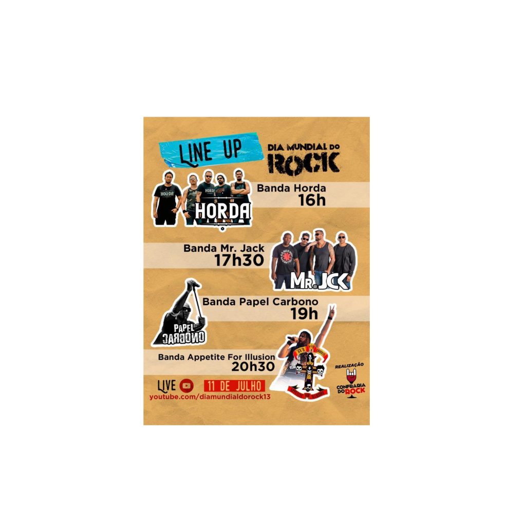 Para celebrar o Dia Mundial do Rock, será realizada neste sábado (11), o Festival Dia Mundial do Rock – Um show de solidariedade. A iniciativa terá início às 16h com transmissão ao vivo através do canal do YouTube do Dia Mundial do Rock 13.