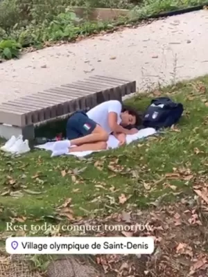 Thomas Ceccon dormindo na parte externa na Vila Olímpica Imagem: Reprodução/Instagram @huseinalireza