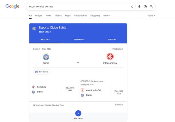 Na prática, quem pesquisa por “Esporte Clube Derrota” recebe em destaque as informações que normalmente apareceriam para “Esporte Clube Bahia”, como tabela de jogos, elenco e até mesmo notícias recentes.