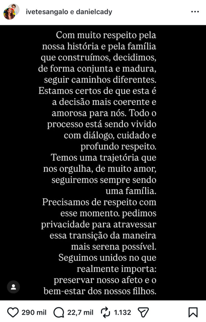 No texto, o ex-casal afirma que todo o processo vem sendo conduzido de forma serena. “Todo o processo está sendo vivido com diálogo, cuidado e profundo respeito. Temos uma trajetória que nos orgulha, de muito amor, seguiremos sempre sendo uma família”, acrescenta.