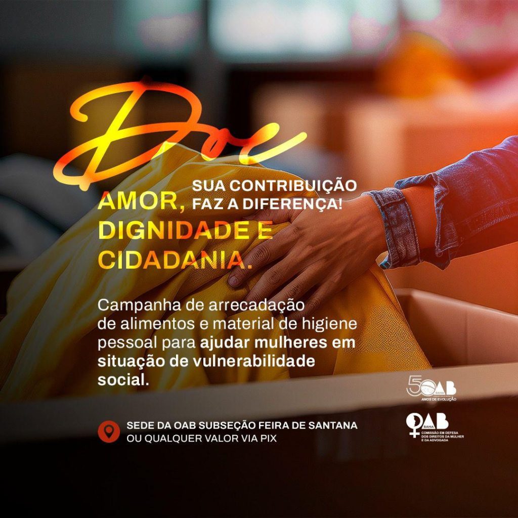 A OAB Subseção Feira de Santana, através da Comissão em Defesa dos Direitos das Mulheres e das Advogadas promove campanha de arrecadação anual de alimentos e material de higiene pessoal para mulheres em situação de vulnerabilidade social.