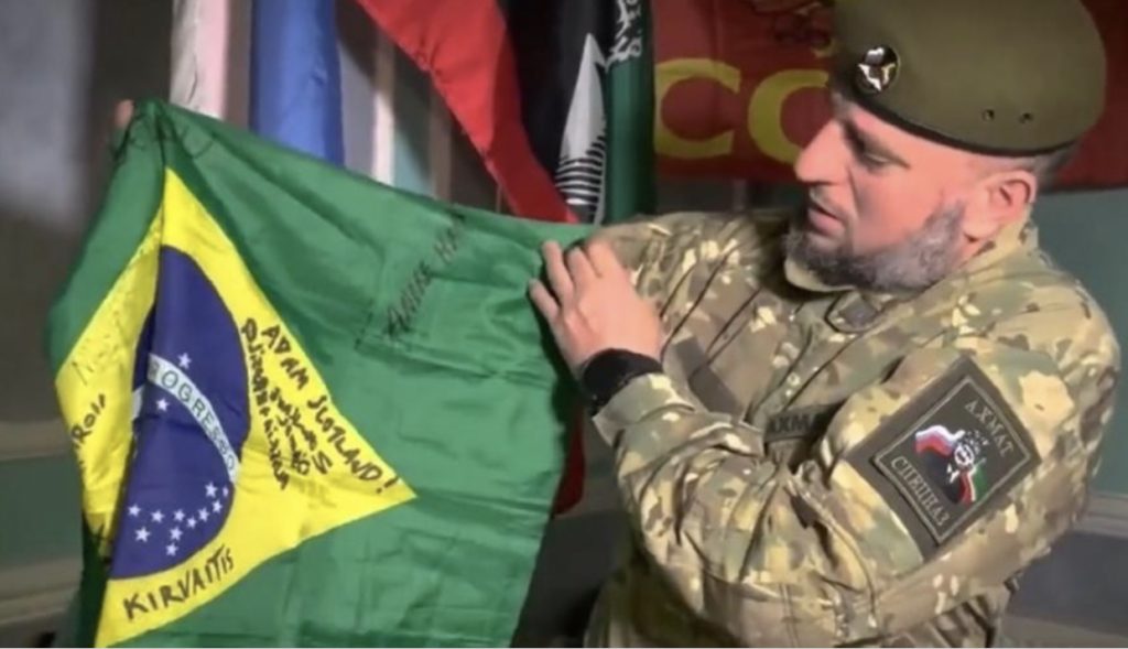 A bandeira do Brasil que pertencia ao combatente André Hack Bahi, o primeiro brasileiro aliado das tropas ucranianas morto em combate, apareceu nas mãos de um suposto combatente checheno, que atua ao lado da Rússia no conflito.