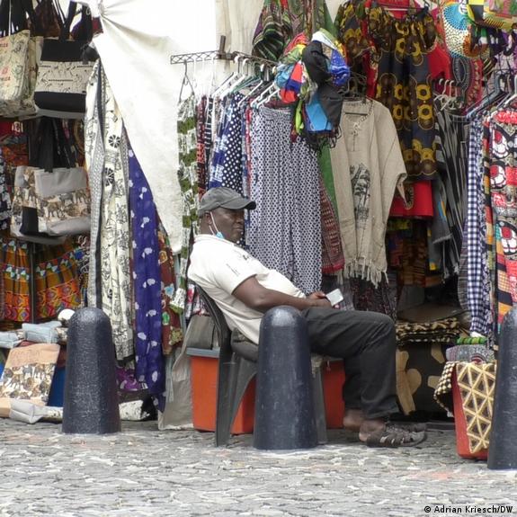 “Na semana passada os alemães ainda estavam aqui”, diz uma congolesa vendendo bolsas, colares e camisetas. “Agora eles estão voltando para casa porque têm medo de ficar retidos aqui. A economia está em baixa. Sem clientes, não há negócios”.