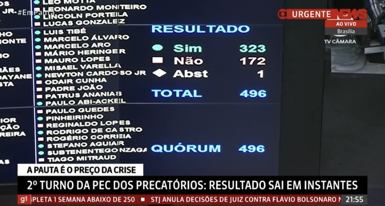 Por 323 votos a 172 e uma abstenção, a Câmara dos Deputados aprovou na noite desta terça-feira (9), em segundo turno, a proposta de emenda à Constituição (PEC) dos Precatórios. Todos os destaques (sugestões pontuais de mudança ou retirada de trechos do texto principal) do segundo turno foram rejeitados. A matéria segue agora para o Senado.