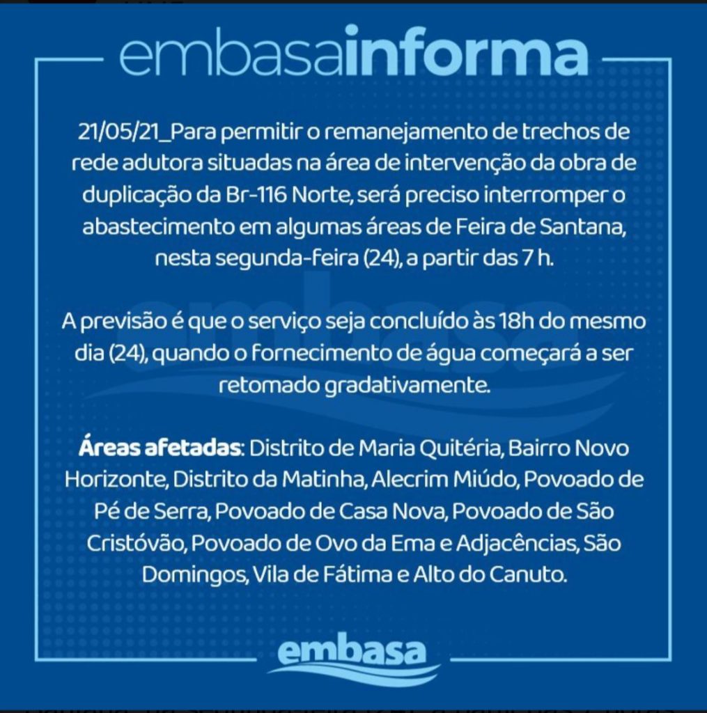 A bacia Jacuípe, na quinta-feira, 27, abrange os bairros como Caseb, Parque Lagoa Grande, SIM, Santo Antônio dos Prazeres, Cidade Nova e Parque Ipê, e a bacia Pojuca, na sexta, 28, (Pedra do Descanso, São João do Cazumbá, Baraúna, Jussara, Jardim Cruzeiro, entre outros).