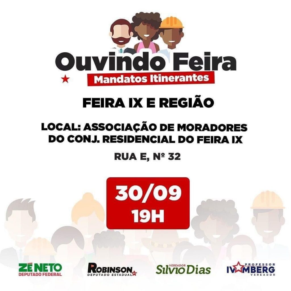 A Caravana Ouvindo Feira, realizada pelos Mandatos Itinerantes dos deputados federal Zé Neto e estadual Robinson Almeida, e dos vereadores Silvio Dias e Professor Ivamberg, está de volta e a primeira parada é no bairro Feira IX nesta quinta-feira (30). O encontro acontecerá às 19h, na Associação de Moradores, situada na rua E, nº 32, e seguirá todos os protocolos sanitários de combate à Covid-19.