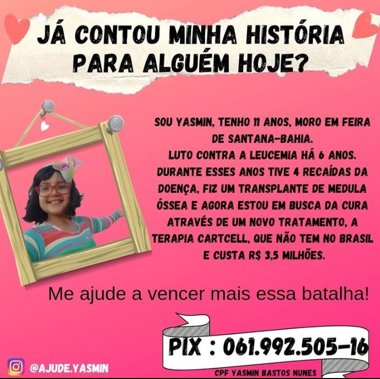 A pequena Yasmin Bastos, (10 anos), luta contra um câncer há 6 anos. A criança sofre de Leucemia extramedular e já teve 4 recaídas. Yasmin passou por um transplante de medula óssea e precisa se submeter a um novo tratamento, através da terapia CAR-T Cells, células de defesa do organismo, que são extraídas e moldadas em laboratório para combaterem um tumor. Depois, são infundidas de volta ao paciente. Ou seja, elas agem reprogramando as próprias células do paciente contra a doença. O tratamento custa R$ 3,5 milhões de reais. Por conta do alto valor, a família de Yasmin está pedindo ajuda e disponibilizou duas contas e uma chave PIX para doações: