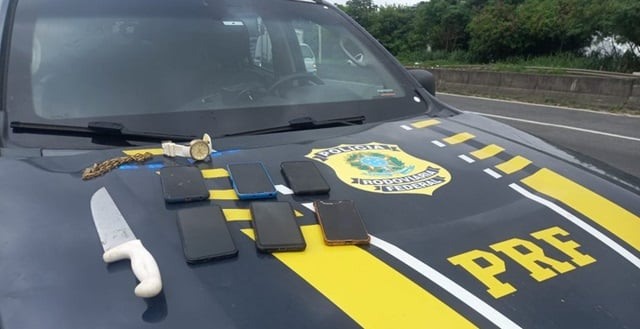 Os policiais conseguiram interceptar o homem e após uma vistoria pessoal, foi encontrada com ele uma faca ‘peixeira’ utilizada para ameaçar às vítimas. Também foram recuperados os objetos subtraídos: 06 celulares, 01 relógio e 01 gargantilha.