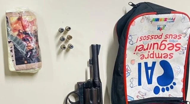 Foi encontrado dentro do carro, uma arma de fogo, tipo pistola, marca Taurus, calibre 380, com numeração suprimida, munições de mesmo calibre da arma e certa quantidade de cigarros de substância análoga à maconha.