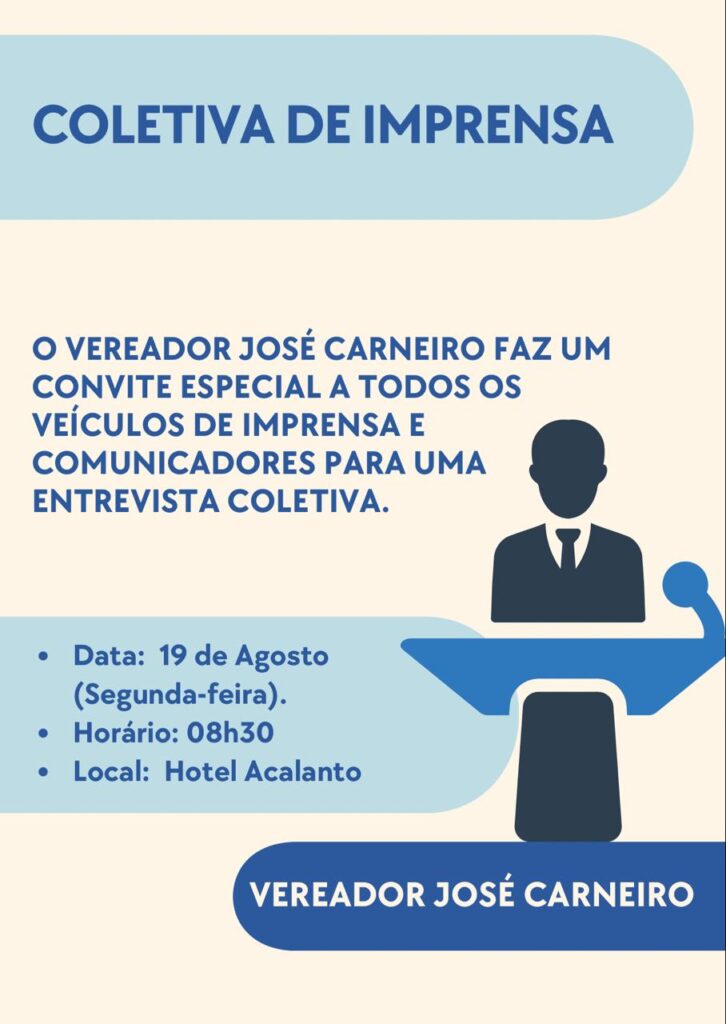 O vereador José Carneiro está convidando todos os veículos de imprensa e comunicadores para uma entrevista coletiva que será realizada na próxima segunda-feira, dia 19 de agosto. O evento acontecerá no Hotel Acalanto, com início marcado para as 08h30.