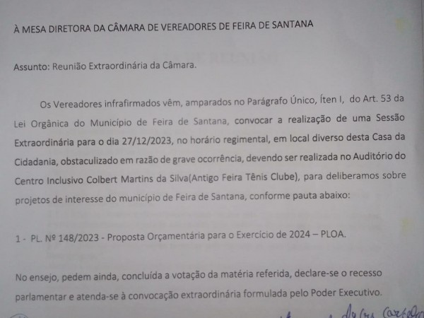 Após uma reunião entre a maioria dos vereadores que compõem a Mesa Diretiva da Câmara Municipal de Feira de Santana, acompanhada também pela maioria dos edis da Casa, na manhã desta sexta-feira (22), ficou decidida a realização de uma sessão extraordinária no próximo dia 27 para apreciação do projeto de lei do Orçamento do Município em 2024. A sessão extraordinária ocorrerá no Centro de Educação Inclusiva Colbert Martins da Silva. A decisão dos vereadores é respaldada pelo Parágrafo Único, Ítem I, do Art. 53 da Lei Orgânica do Município. A análise da matéria acontecerá no horário regimental, a partir das 8h30.