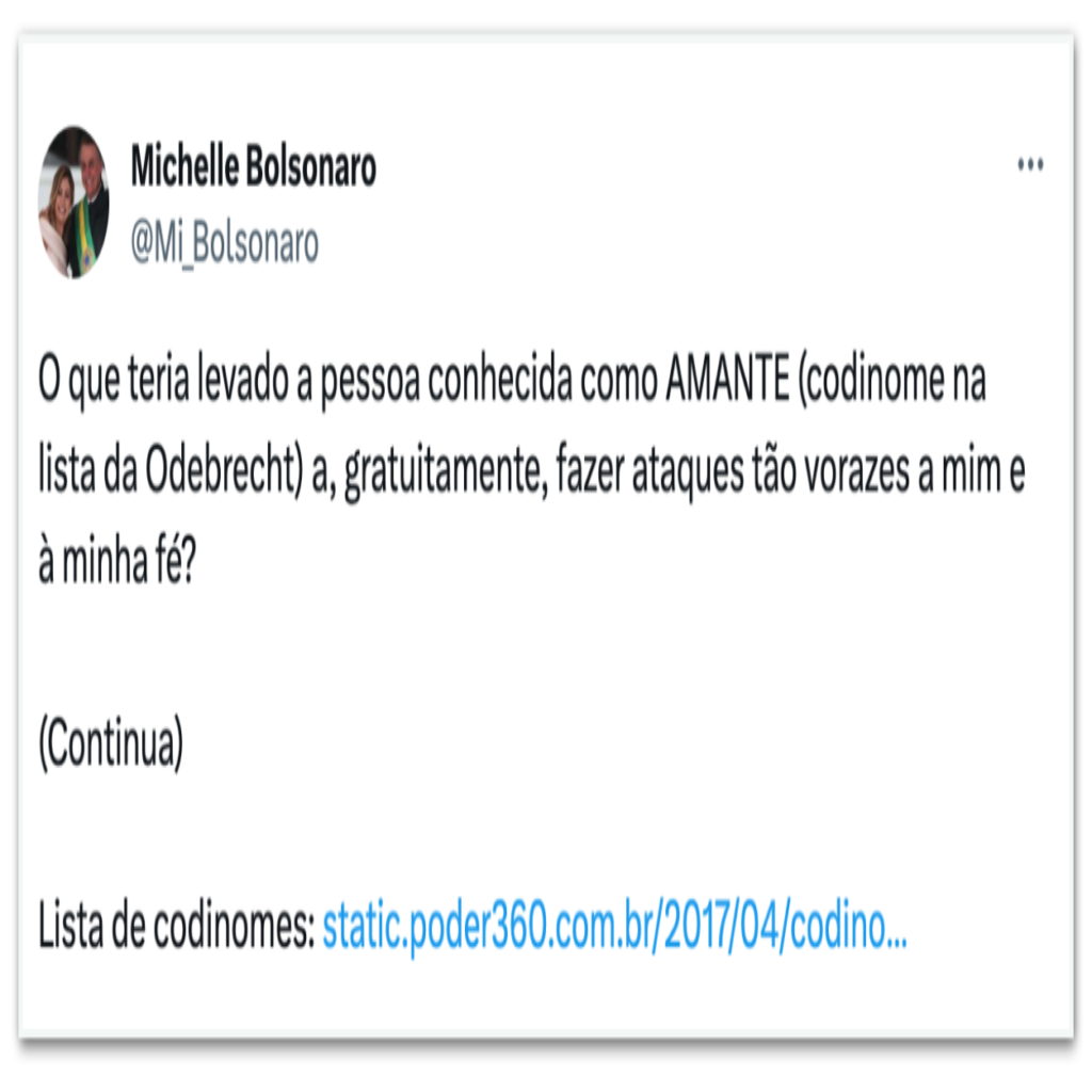A ex-primeira-dama questionou em seu perfil no X (antigo Twitter), “o que teria levado a pessoa conhecida como AMANTE (codinome na lista da Odebrecht) a, gratuitamente, fazer ataques tão vorazes” a ela e a sua fé. Michelle refere-se a história de que supostos beneficiados por esquema da Odebrecht tinham apelidos para ninguém desconfiar para quem iria o dinheiro de contratos superfaturados. Na relação, Gleisi aparece como “amante” e “coxa”.