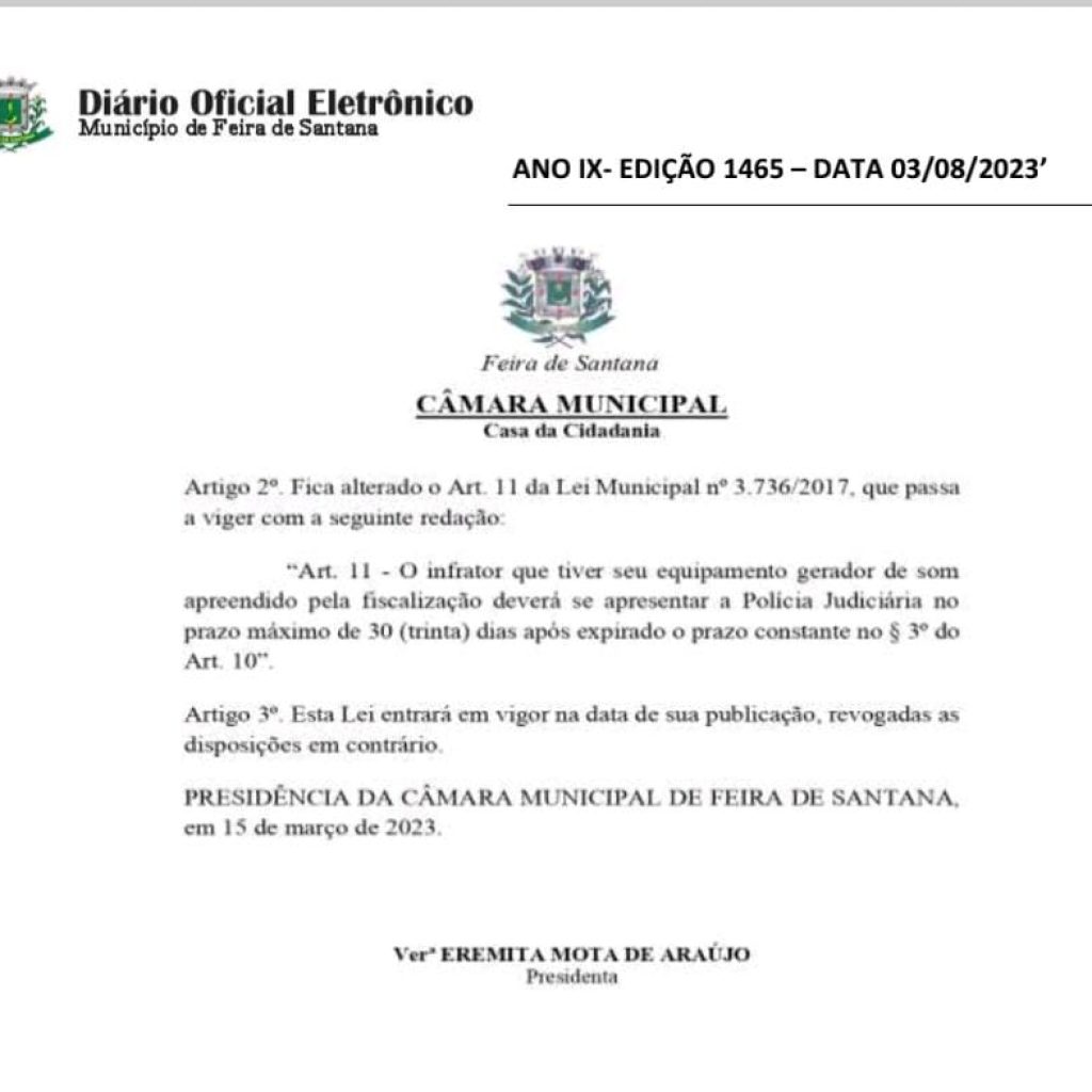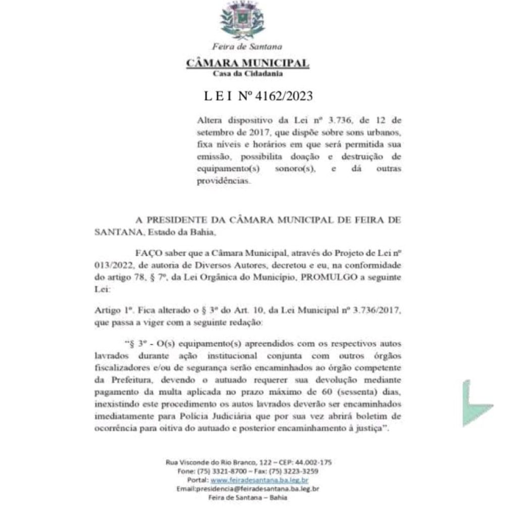 A Câmara Municipal de Feira de Santana aprovou nesta semana a Lei 4162/23, de autoria do vereador Flávio Arruda (Galeguinho SPA/ PSD), que altera o artigo 11 da Lei 3.736/17, sobre sons automotivos urbanos. Ou seja, os equipamentos sonoros apreendidos por órgãos de fiscalização serão encaminhados para a Secretaria Municipal de Meio Ambiente, e poderão ser devolvidos aos respectivos donos mediante pagamento de multa no prazo máximo de até 60 dias, caso contrário o infrator deverá se apresentar à Polícia Judiciária que abrirá boletim de ocorrência para oitiva do autuado e encaminhamento à justiça.