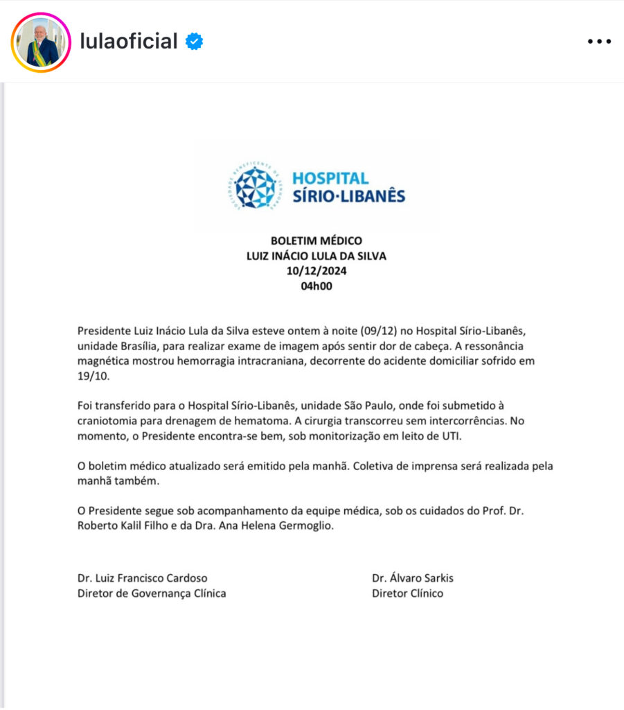 O presidente Luiz Inácio Lula da Silva foi submetido a uma cirurgia de emergência na madrugada desta terça-feira (10) para drenagem de uma hemorragia intracraniana após sentir dor de cabeça.