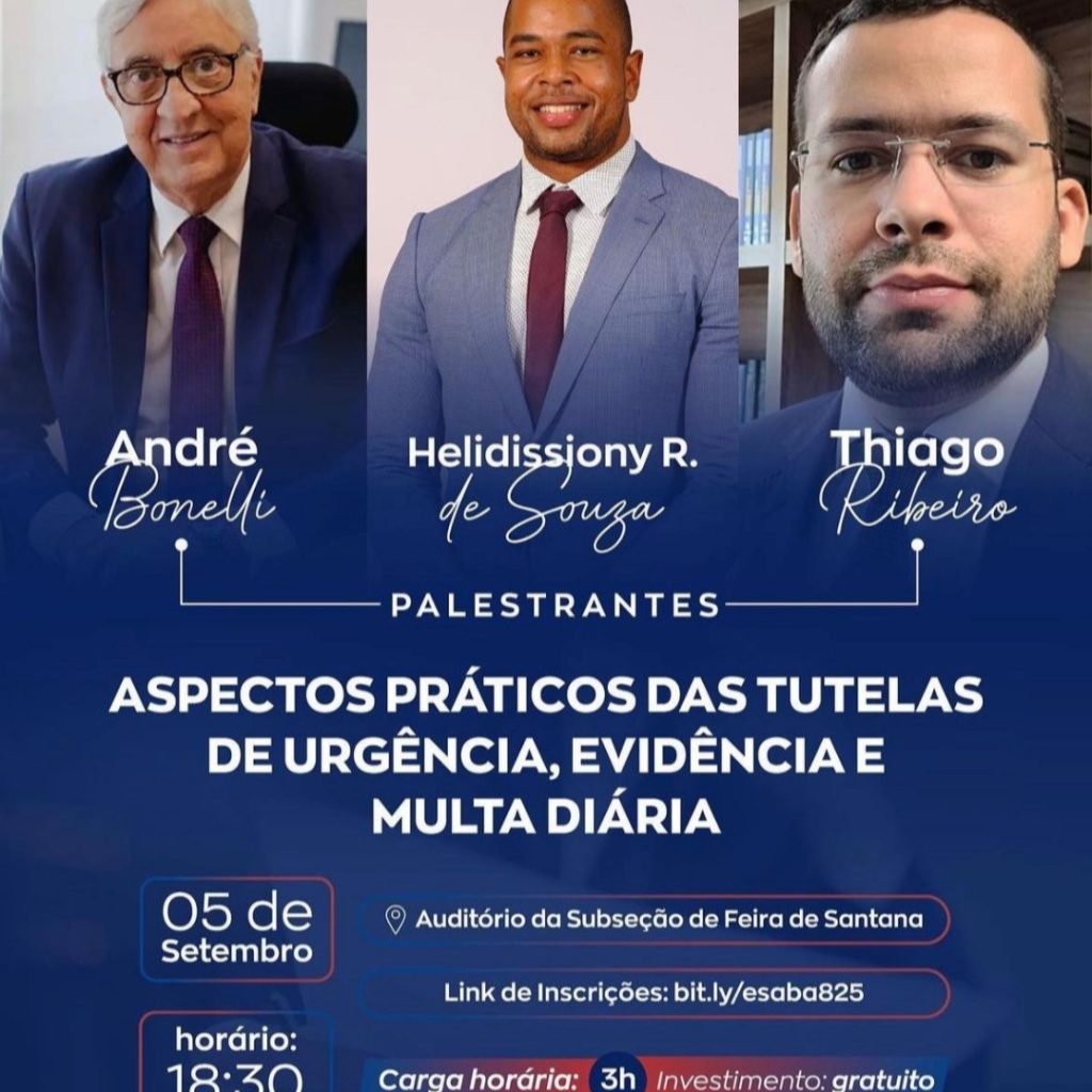 A ESA também promoverá o curso “Aspectos Práticos das Tutelas de urgência, de Evidência e Multa Diária”, ministrado por três renomados especialistas na área: André Bonelli, Helidissiony R. de Souza e Thiago Ribeiro.