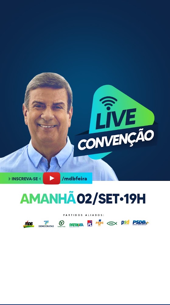 Por conta da pandemia do coronavírus, a convenção será realizada presencialmente apenas para homologação das candidaturas. O ato de encerramento será transmitido em uma Live no canal oficial do youtube do MDB de Feira de Santana: http://bit.ly/CanalMDBFeira.