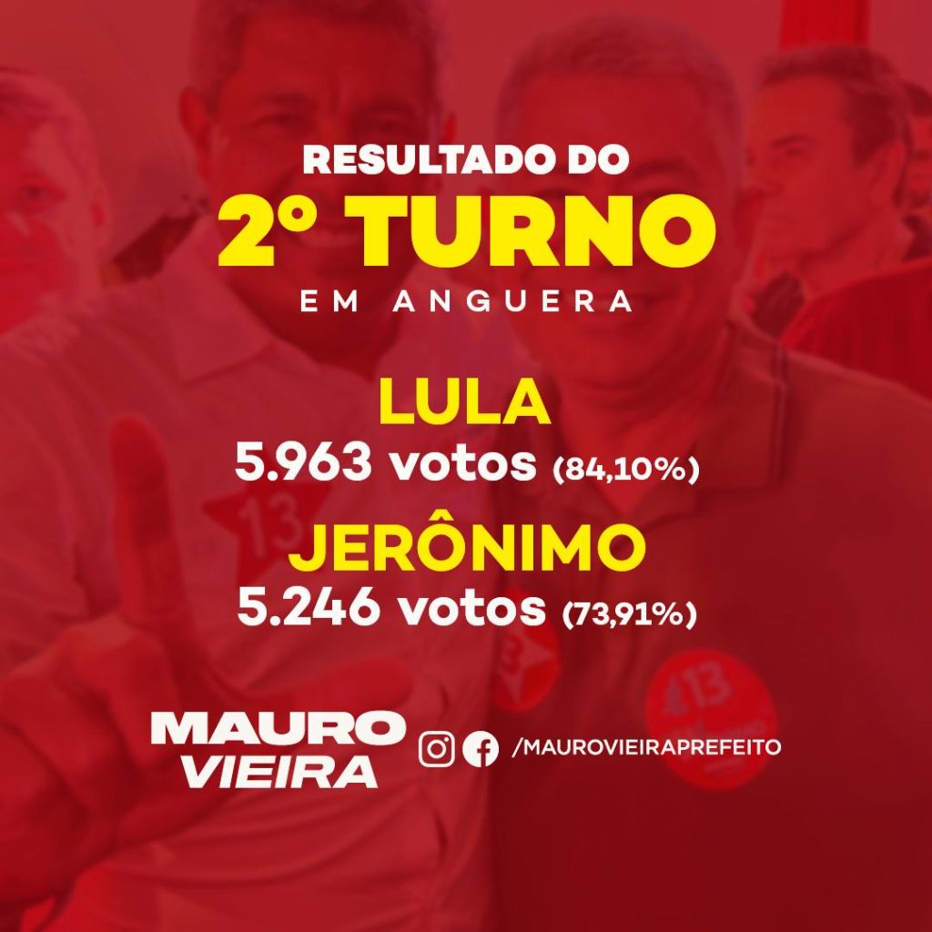 O município de Anguera teve votação expressiva para os candidatos do PT para governador e presidente. Com o apoio do prefeito Mauro Vieira, os candidatos tiveram a maioria dos votos dos eleitores da cidade. Lula teve 84,10% dos votos e Jerônimo teve 73,91%.