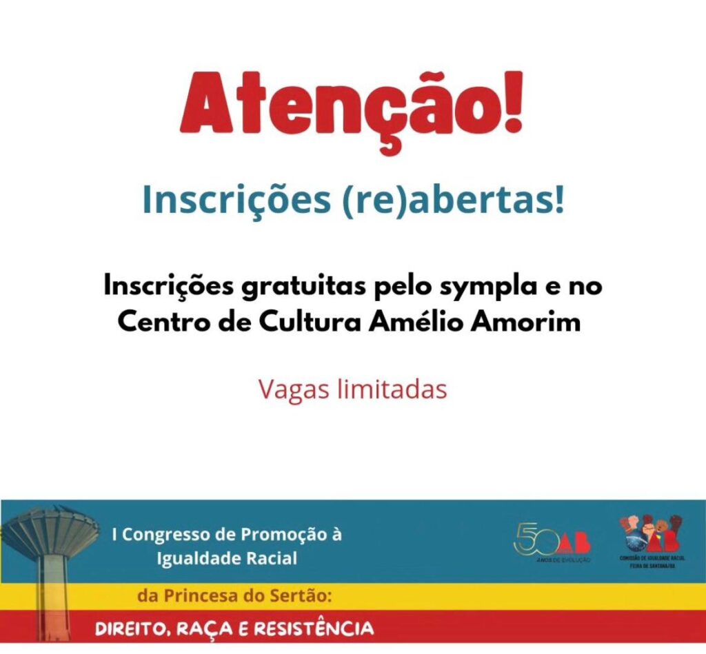 A Comissão de Igualdade Racial da OAB Subseção Feira de Santana está promovendo, desde ontem (17) e nesta quarta (18), o “I CONGRESSO DE PROMOÇÃO À IGUALDADE RACIAL DA PRINCESA DO SERTÃO”, no Centro de Cultura Amélio Amorim. O evento terá hoje atividades como palestras e mesas redondas durante todo o dia.