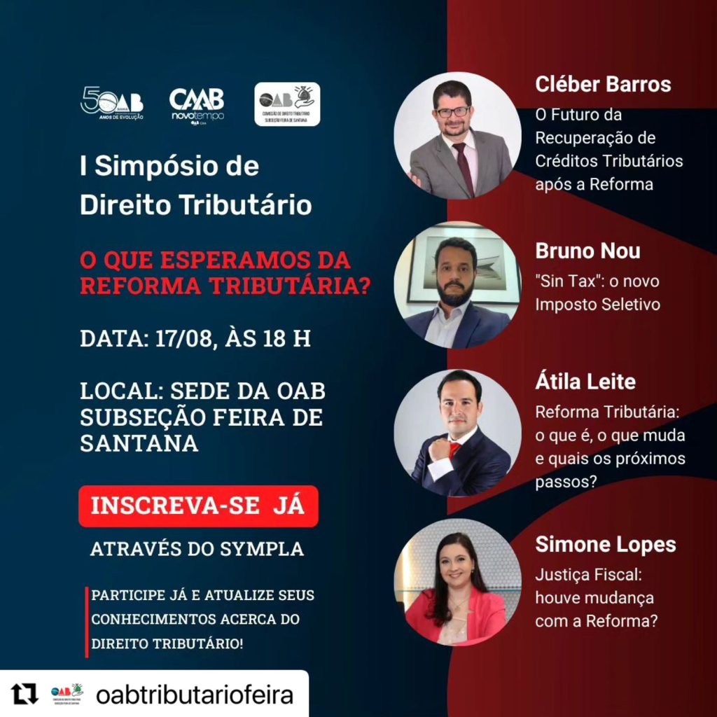 O evento terá como palestrantes Cléber Barros, que falará sobre “o futuro da recuperação de créditos tributários após reforma”; Bruno Nou, que discutirá “Sin Tax: o novo imposto seletivo”; Átila Leite, que abordará o tema “Reforma tributária: o que é, o que muda e quais os próximos passos”; e Simone Lopes, presidente da Comissão de Tributário da OAB Feira, que vai tratar com os presentes sobre “Justiça Fiscal: houve mudança com a reforma?”. Interessados em participar podem acessar o link: bit.ly/simposiodireitotributario e conferir mais informações no instagram da comissão: @oabtributariofeira.