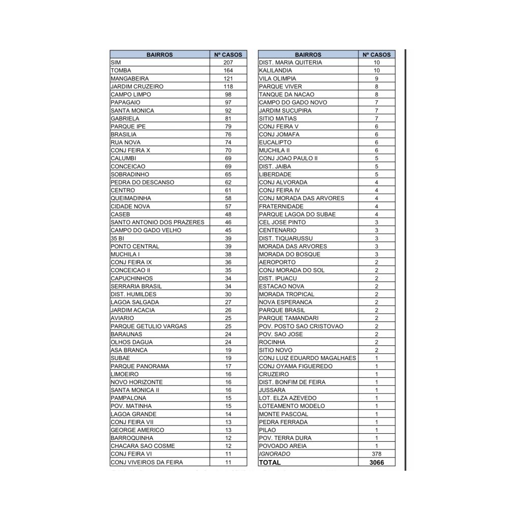 Confira os números de infectados nos bairros e distritos de Feira de Santana