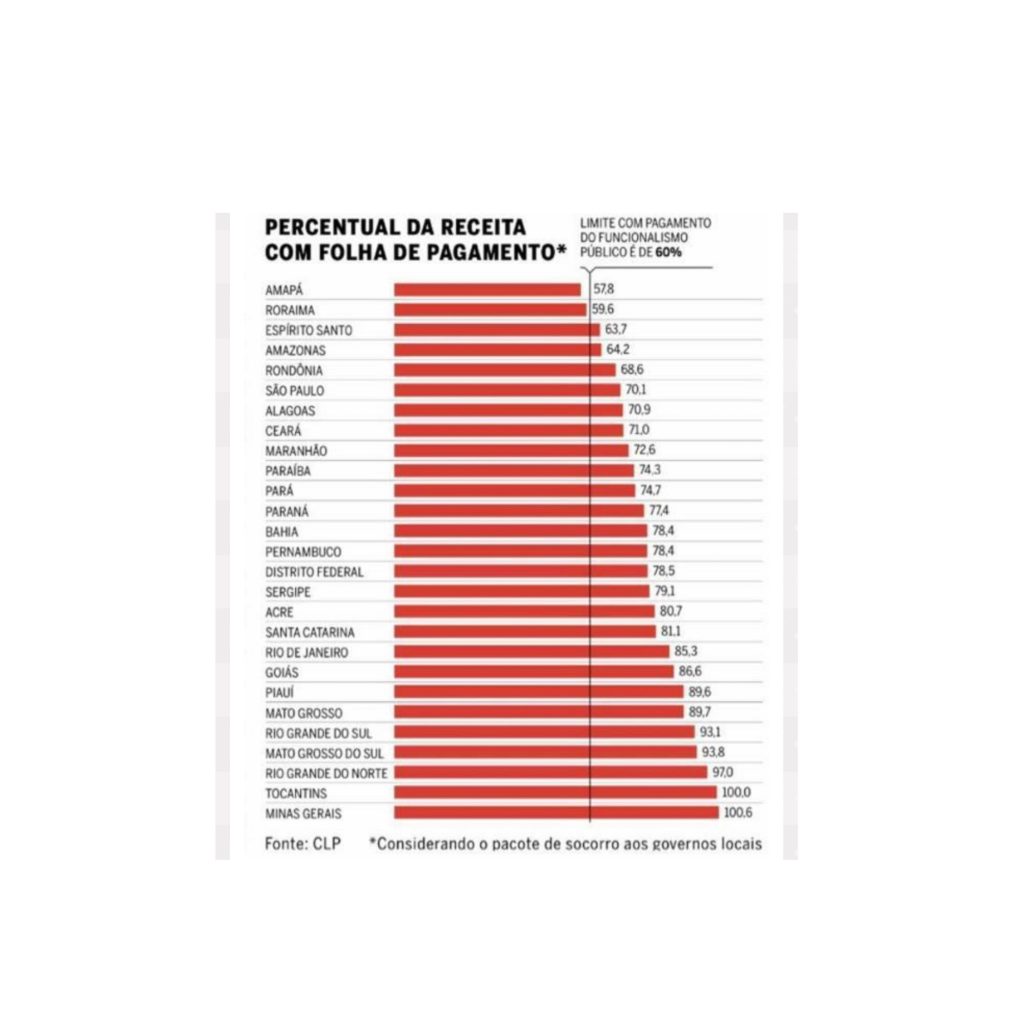 O levantamento feito pelo CLP mostra que 25 dos 27 estados devem comprometer mais de 60% da receita corrente líquida (RCL) com folha de pagamento por causa do efeito da pandemia na arrecadação este ano.