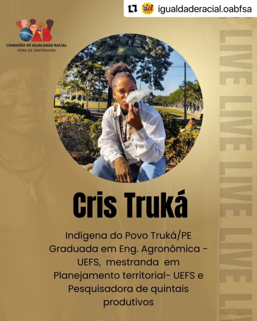 Uma das participantes da live é Cris Truká, indígena do Povo Truká/PE, graduada em Eng. Agronômica na UEFS, mestranda em Planejamento territorial, também na UEFS, e Pesquisadora de quintais produtivos. O outro participante é Pedro Tingui João, jovem liderança do Povo Tingui Botó, e membro e secretário da Associação Indígena Ipioca II, além de ser graduando em Eng. Agronômica na UEFS.