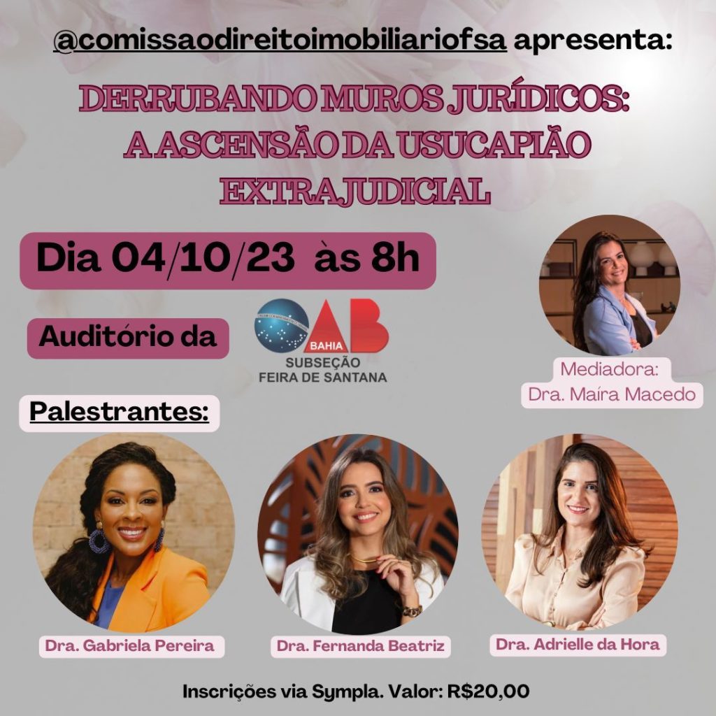 A Comissão de Direito Imobiliário da OAB Subseção Feira de Santana vai realizar, nesta quarta-feira (4), a partir das 8h, na sede da instituição, um evento intitulado “Derrubando Muros Jurídicos: a ascensão da usucapião extrajudicial”. O valor para participar do evento é de R$20,00 e as inscrições podem ser feitas através do Sympla. Vale ressaltar que idoso e estudantes pagam meia entrada.