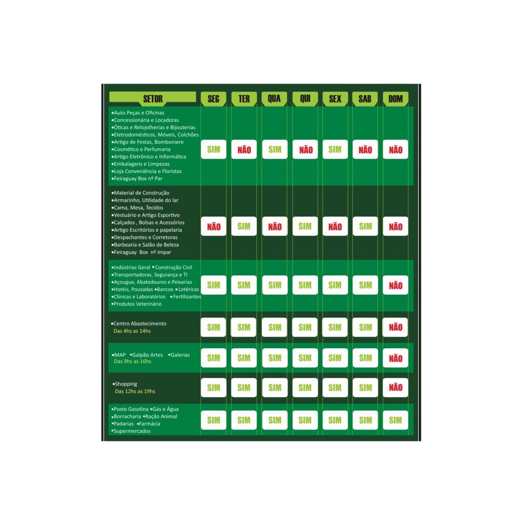 2o – Os fornecedores de produtos e serviços essenciais permaneceram com funcionamento durante todos os dias, são eles: os mercados; supermercados; hipermercados; açougues; frigoríficos; granjas; peixarias; lojas de hortifrutigranjeiros; as feiras livres de produtos alimentícios; o Centro de Abastecimento; os Postos de Combustíveis; revendedores de gás; as Farmácias; Instituições Bancárias; Correspondentes Bancários; Casas Lotéricas; clínicas e laboratórios; clínicas veterinárias; produtos veterinários e rações animais; serviços de transporte e logísticas; bem como o setor de tecnologia da informação.