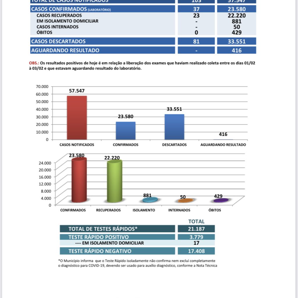 Total de testes rápidos realizados: 21.187 (Período de 06 de março de 2020 a 07 de fevereiro de 2021)