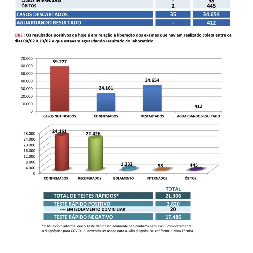Total de testes rápidos realizados: 21.306 (Período de 06 de março de 2020 a 14 de fevereiro de 2021)