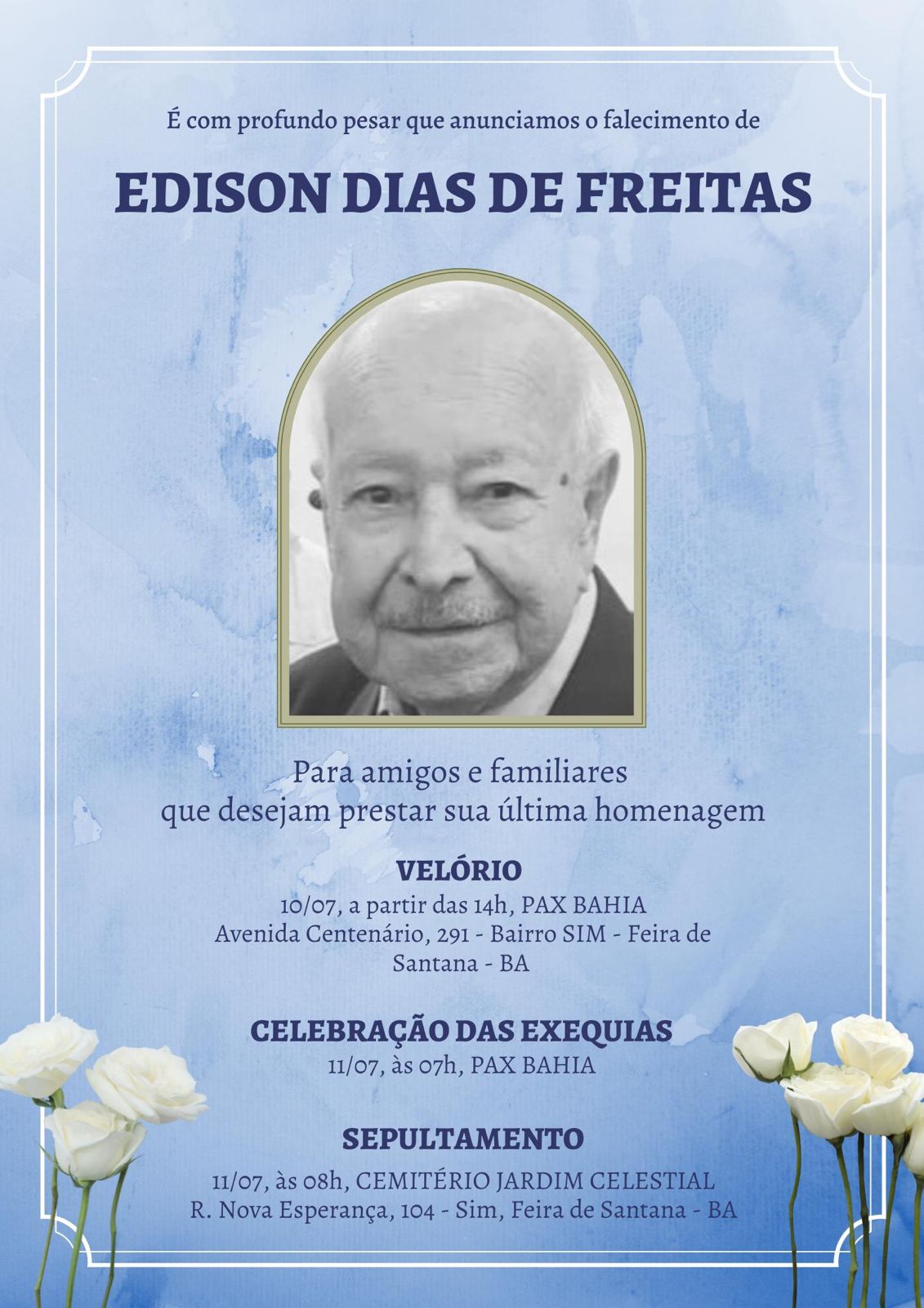 O Governo Municipal de Feira de Santana manifesta profundo pesar pelo falecimento de Edison Dias de Freitas, aos 86 anos, ocorrido nesta quinta-feira (10). Inspetor aposentado da Polícia Rodoviária Federal (PRF), Edison era reconhecido por sua trajetória de dedicação ao serviço público e à segurança viária.