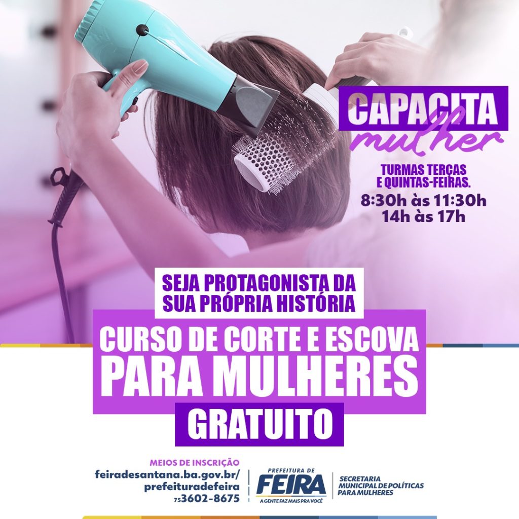 A Secretaria Municipal de Políticas para as Mulheres (SMPM) está com inscrições abertas para o curso gratuito de corte de cabelo e escova. As vagas são destinadas exclusivamente para mulheres e as interessadas podem se inscrever até o dia 20 no site da Prefeitura de Feira de Santana (feiradesantana.ba.gov.br) ou por telefone através do 3602-8675. O curso é o primeiro oferecido pelo projeto Capacita Mulher, lançado recentemente pelo órgão em alusão à campanha Agosto Lilás – de combate à violência contra a mulher.As aulas estão previstas para ocorrer toda terça e quinta-feira, das 8h30 às 11h30 e das 14h às 17h, na sede da Secretaria da Mulher. O curso tem duração de três meses, com carga horária de 60 horas e será dividido em duas turmas. A data será divulgada posteriormente.De acordo com a secretária de Políticas para as Mulheres, Gerusa Sampaio, a iniciativa visa fortalecer a independência financeira das mulheres.”O curso surgiu como uma oportunidade de dar protagonismo para mulheres que queiram iniciar no ramo do empreendedorismo. Dessa maneira, ela garantirá sua independência financeira e crescerá profissionalmente. As aulas serão conduzidas por profissionais experientes do ramo”, pontua a secretária.A Secretaria da Mulher está localizada na rua Georgina Erisman, 185, Centro.