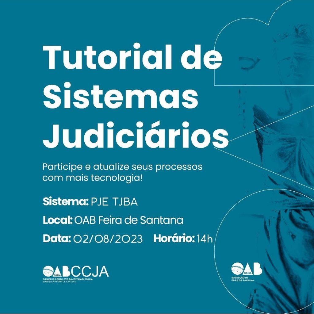 Mais um tutorial de sistemas judiciários será realizado nesta semana, 2 de agosto, às 14:00, na sede da OAB Subseção Feira de Santana. Dessa vez haverá explicações acerca do PJE e TJBA. A ideia destes tutoriais é que os participantes atualizem seus processos com mais tecnologia. Os interessados podem se inscrever através do link: https://www.sympla.com.br/evento/tutorial-dos-sistemas-judiciarios-pje-tjba/2095627?fbclid=PAAabjOfrPH8XbpbWRUpBT-f45s-gvf0HKt5vTfjzHhUfDXieJhM4xfp6TqDA_aem_ASoJftDagU2X0dBH1-Oqed-bagI8Z8r3fs2VRio0_dAyAb-1Pmk9-c4NB6IMyXKm23k.